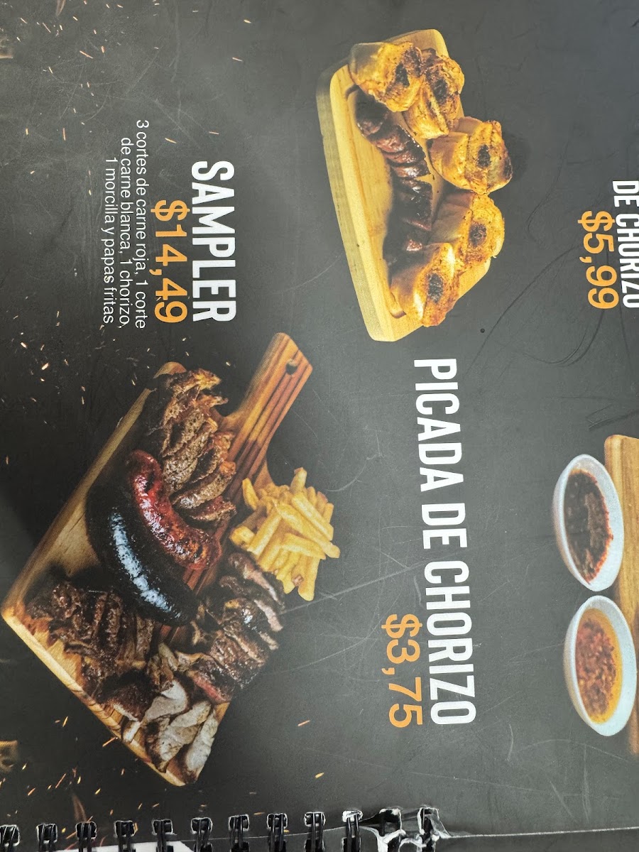 Pequeñas porciones de 3 tipos de carne de res y una de cerdo, acompañada de un chorizo, una morcilla y porción de papas.